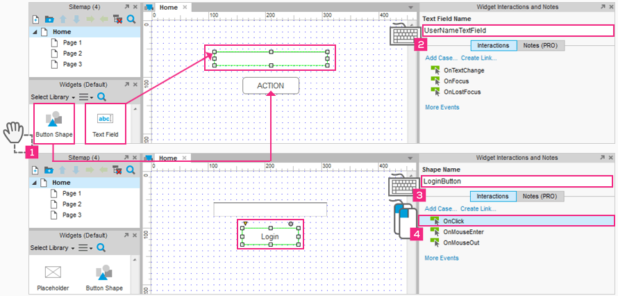 放置一个文本框部件和一个 Button Shape 部件到设计区域。