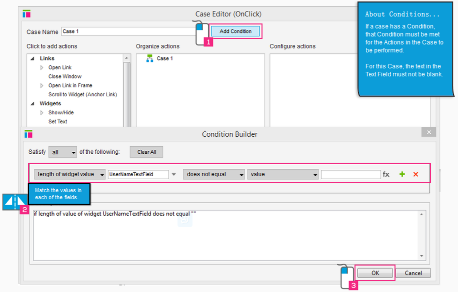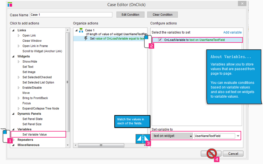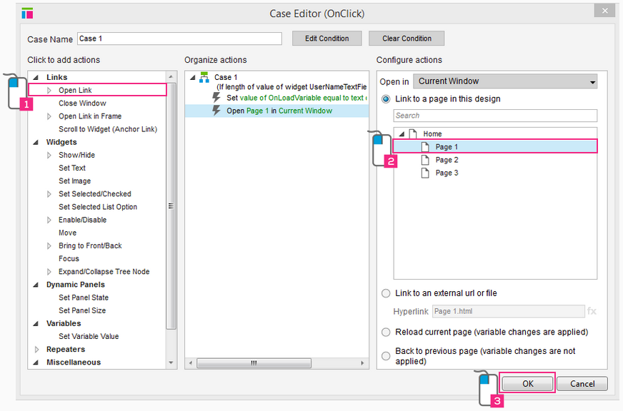 创建“条件”,以检查一个文本字段中的文本是否是空白,基于输入链接到相应的页面。 使用一个变量来存储文本框输入的文本。然后,使用变量设置部件在下一个页面上的文本上。