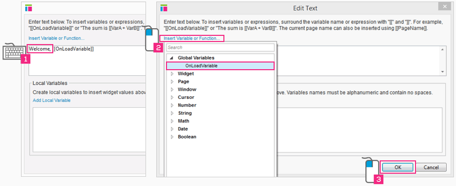 点击“插入变量或函数...”打开下拉列表框。选择 OnLoadVariable 在文本中插入 [OnLoadVariable].