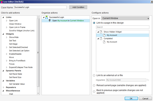 在设计区域选中 Log 按钮。添加一个事例到 OnClick 事件,然后在事例编辑器中改变事例的名字为 Successful Login。接着添加一个 Open Link 动作然后选中 My Account 页面。