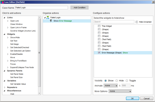 添加第二个事例到 OnClick 事件,并起名为 Failed Login。接着添加动作 Show,选中 Error Message,点 OK。