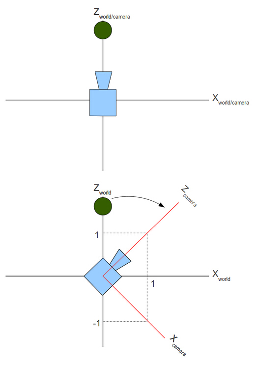 上面的例子很简单,因为相机的方向已经沿着 Z 轴负方向,并且通常相机的朝向都是沿着坐标轴的。但是如果相机指向其他方向将会发生什么呢?看下面的图片。简单的说,这是一个 2D 坐标系统,我们沿着 Y 轴的负方向观察。