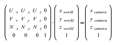 为了把一个位置向量从世界坐标系空间变换到由 UVN 向量定义的相机坐标系空间中,我们需要在位置向量和 UVN 向量之间进行一个点乘运算,它们的运算可以通过下面这个矩阵实现: