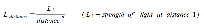 点光源的衰退效应常被叫做“衰减”。实际物体的“衰减”遵循平方反比法则(光强与物体到光源的距离的平方成反比)。数学公式如下: