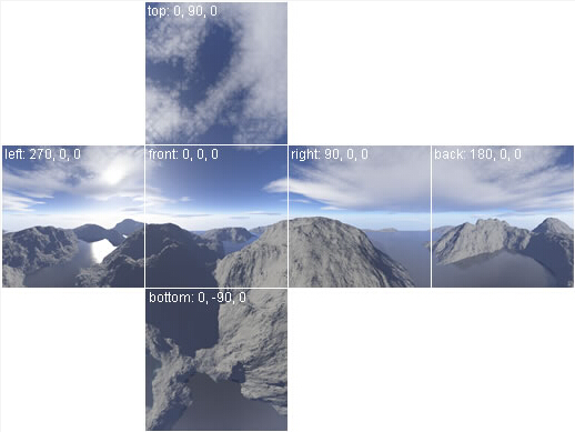一个特殊类型的纹理会被映射到这个立方体上,这个纹理的创建是与其贴到立方体上的方式相关的,立方体上每个面的纹理与其相邻的面上的纹理的边缘都可以很好的贴合,就如下面这个情况一样:
