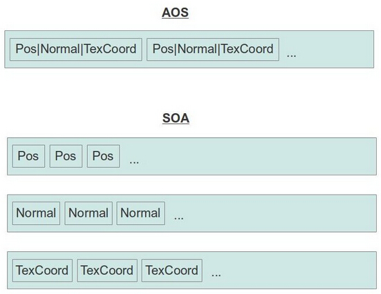 在这一课中,我们基于上面所讲的 VAO 对 Mesh类进行更新。除此之外,我们将使用 SOA(存放数组的结构体)方法组织缓冲区中的顶点数据。现在为止我们的顶点数据都是用一个包含各种顶点属性(如位置属性等)的结构体表示的,顶点缓存中包含了一个又一个的顶点结构体,缓存中的这种数据保存方式称作 AOS(存放结构体的数组)。 SOA 是这种模式的一个简单变换,这种模式下缓存中存放的是一个包含了多个数组的结构体,每个数组中都只存放顶点的某一个属性,为了得到某一个顶点的所有属性,GPU 会使用这个顶点的索引从每个数组中读取数据,这个方式对某些 3D 模型文件来说效率会更高一些,而且对于同样的问题,了解一些不同的解决方法也是很有趣的。