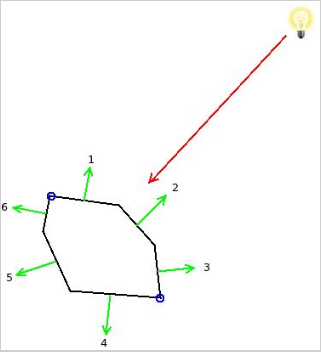 红色的箭头代表了照射到三条边上(在 3D 世界中这些边应该看做三角形,这里仅仅是为了说明问题用 2D 世界的一条边来代表 3D 世界的一个三角面)的光线,这三条边的法线方向分别为 1,2 和 3(这些法线光照方向的反方向的向量之间的点乘结果很明显都大于 0)。法线方向分别为 4,5 和 6 的边都没有朝向光源(进行同样的点乘操作这些边的结果都会小于小于或等于 0 )。被蓝色的圆圈标记的两个点就可以看做是这个对象的轮廓,因为边 1 是朝向光源的,但是它的相邻边 6 确不是,所以他们之间的点就是轮廓的一部分。对于其他轮廓点的判定也是一样的。如果某一条边朝向光源,但是与他相邻的边也是朝向光源的那么他们之间共享的点就不是轮廓的一部分(如边 1 和边 2 之间的点)。