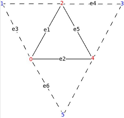 上图中的红色顶点是属于原来的三角形,蓝色的顶点输入这个三角形的邻接三角形(先不用关注边 e1 - e6 ,在编写代码的时候才会用到他们)。如果我们将上面图中所示格式的数据保存到顶点缓存中,VS 会对所有的顶点都执行一次(不论顶点属于邻接三角形还是原始三角形),GS (如果有的话)则会对上面这样的每一组顶点执行一次(包括原始三角形和邻接三角形的顶点)。如果存在 GS 开发者可以输出一个拓扑结构,但是如果没有 GS 则光栅化阶段会直接忽略这些邻接数据。