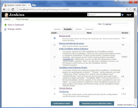 第2步 - 在可用选项卡上,搜索“Backup Plugin”。点击“Install without Restart”。完成后,重新启动Jenkins实例