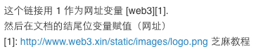 这个链接用 1 作为网址变量 [web3][1]. 然后在文档的结尾位变量赋值(网址) [1]: http://www.web3.xin/static/images/logo.png 芝麻教程显示结果如下: