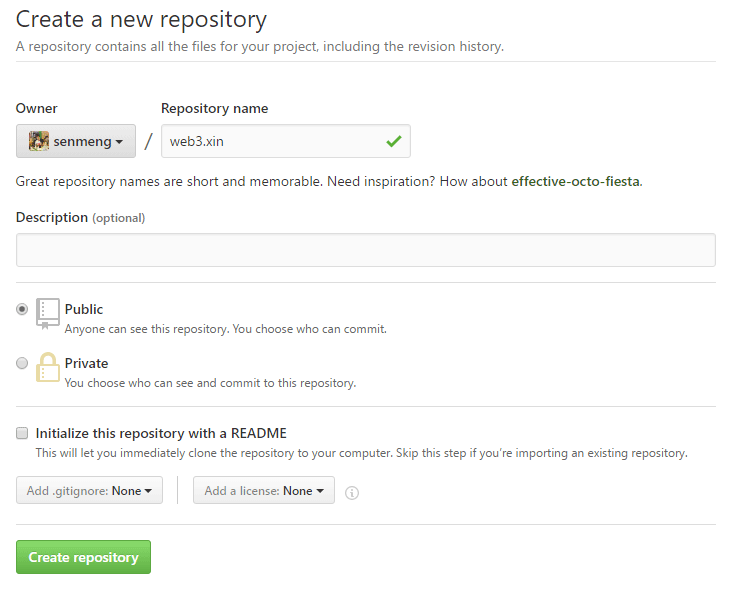 之后在在Repository name 填入 web3.xin(远程仓库名) ,其他保持默认设置,点击"Create repository"按钮,就成功地创建了一个新的Git仓库: