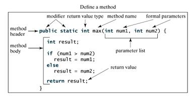 方法包含一个方法头和一个方法体。下面是一个方法的所有部分: