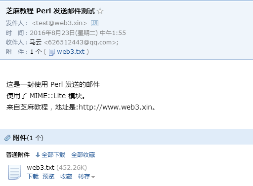 #!/usr/bin/perl # 接收邮箱,这里我设置为我的 QQ 邮箱,你需要修改它为你自己的邮箱 $to = '626512443@.com'; #发送者邮箱 $from = 'test@web3.com'; #标题 $subject = '芝麻教程 Perl 发送邮件测试'; $message = '这是一封使用 Perl 发送的邮件。'; open(MAIL, "|/usr/sbin/sendmail -t"); # 邮件头部 print MAIL "To: $to\n"; print MAIL "From: $from\n"; print MAIL "Subject: $subject\n\n"; # 邮箱信息 print MAIL $message; close(MAIL); print "邮件发送成功\n";执行以上程序,输出结果为: