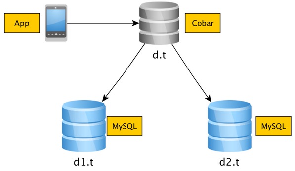 Cobar是阿里的中间件,以Proxy方式提供服务,在阿里内部大量使用,目前已经开源在github了,赞开源精神,据说在很多外部公司有一些成功使用的案例,配置比较容易,不需要依赖其他东西,有Java环境就OK,小试了一把,事务支持比较麻烦,需要通过set autocommit=0来实现,如果想要完美支持的话,还是需要修改JDBC或对应语言的MySQL library,分库示意图(Cobar中d.t分到两个库中:d1.t,d2.t):