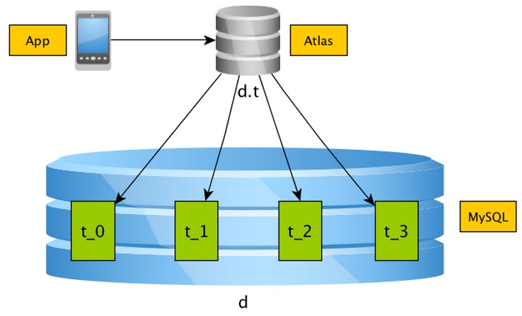 虽然个人对数字公司没啥好感,但是这个Atlas还是非常有特点的,它是基于MySQL-Proxy上二次开发的,主要支持两个特性:分表和读写分离,但是分表的话只支持单库多表,即事实上是不支持分布式分表的,所有分表都在同一个库中,小试了一把,下面是分库示意图(四个分表t_0,t_1,t_2,t_3在同一个库中):