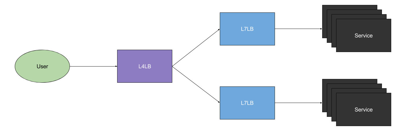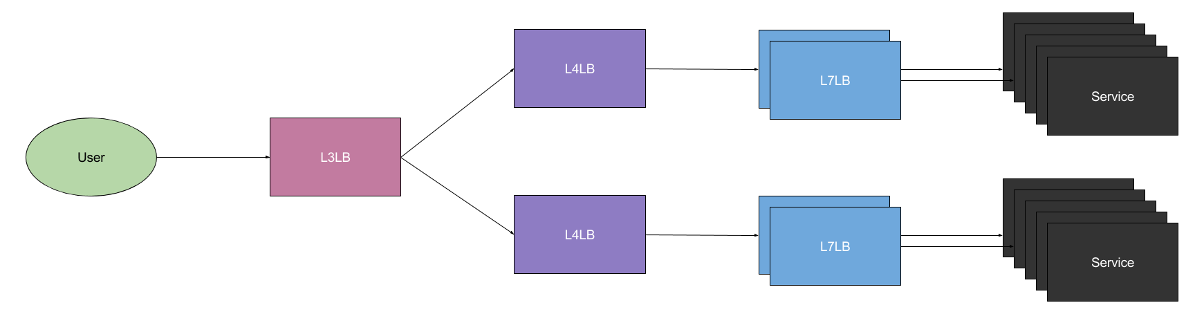 我们可以利用这一点来实现网络层负载均衡,因为在我们看来,每个传输层负载均衡器是相同的。这意味着我们可以把从网络层负载均衡器到传输层负载均衡器的链接看做相同目的地的链路。如果我们把所有负载均衡器绑定到相同 IP 地址,我们可以使用等价路由在传输层负载均衡器之间分配通信。