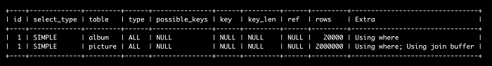 这个查询扫描了picture表2百万行,对每个picture记录扫描了album表2万行。意味着,该查询实际扫描了album表400亿行。这个过程可以更高效。