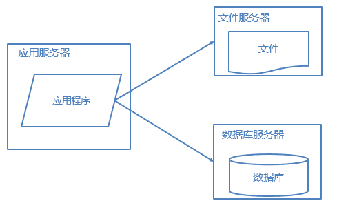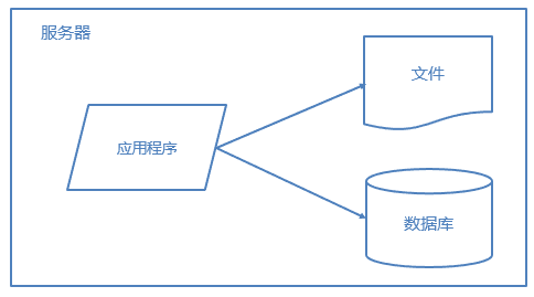 最初业务量不大,访问量小,此时的架构,应用程序、数据库、文件都部署在一台服务器上,有些甚至仅仅是租用主机空间