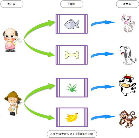 Topic是消息中间件里一个重要的概念,每一个Topic代表了一类消息,有了多个Topic,就可以对消息进行归类与隔离。 可以参照下图的动物园喂食模型,每一种动物都只能消费相对应的食品。