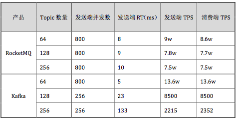 在互联网企业的实际生产环境中,Topic数量和分区都会比较多,这就要求消息中间件在多Topic共存的时候,依然能够保证服务的稳定性。下面就进入测试环节,看看消息发送端,订阅端共存时,Kafka和RocketMQ对多Topic的处理能力。
