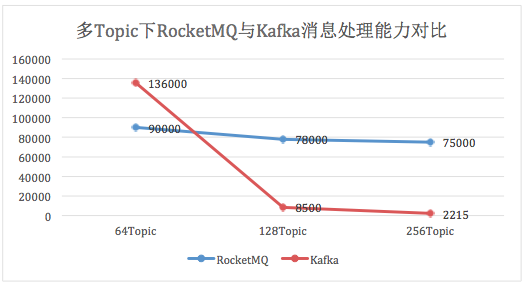 在消息发送端,消费端共存的场景下,随着Topic数的增加Kafka吞吐量会急剧下降,而RocketMQ则表现稳定。