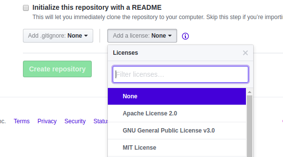 在创建一个仓库时,Github 会为你提供一个预置的软件许可证列表
