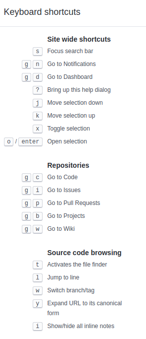 github 仓库页面 提供了一些 快捷键 方便大家快速导航,按 ? 可以查看当前页面支持的 快捷键列表
