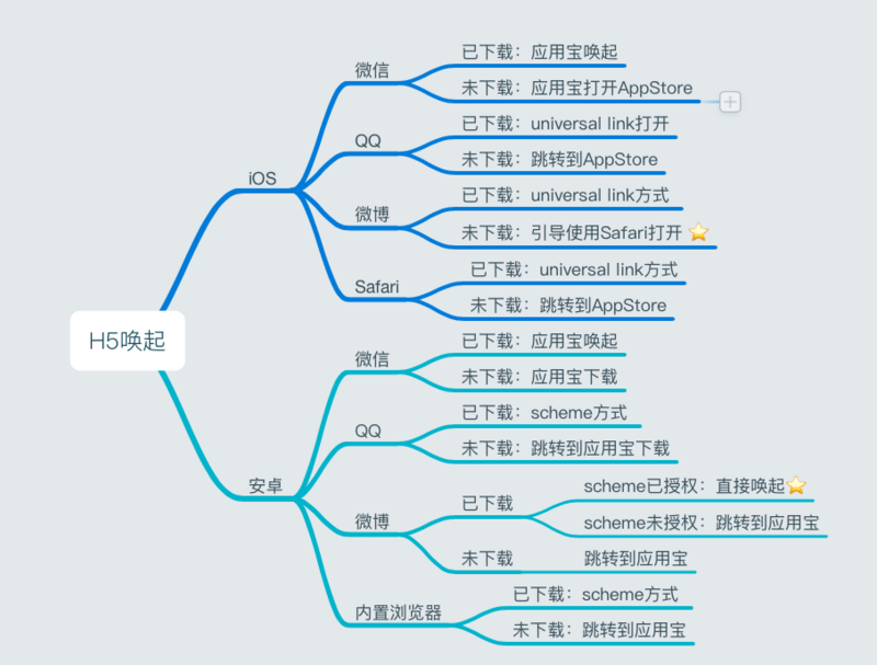 微信是最重要的一种分享渠道,但是我们能够做的,却不多。之前,iOS下的微信支持universal link这种唤起方式,但是从2018年1月8日之后,微信把这个给屏蔽了!!!不管微信基于什么原因,把iOS下这种最便捷的唤起方式屏蔽,我们能做的只能是适应了。so,现在不管是iOS还是android,我们的处理方式是一样的:都是直接跳到应用宝。iOS的应用宝会引导找开AppStore,android的应用宝会直接打开App(前提是你已经下载) 注:微信把itunes链接也屏蔽了,所以也没办法直接跳转AppStore,只能借助应用宝来搭这个桥。