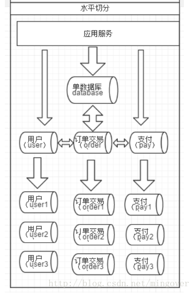 数据的切分(Sharding)根据其切分规则的类型,可以分为两种切分模式。一种是按照不同的表(或者Schema)来切分到不同的数据库(主机)之上,这种切可以称之为数据的垂直(纵向)切分;另外一种则是根据表中的数据的逻辑关系,将同一个表中的数据按照某种条件拆分到多台数据库(主机)上面,这种切分称之为数据的水平(横向)切分。