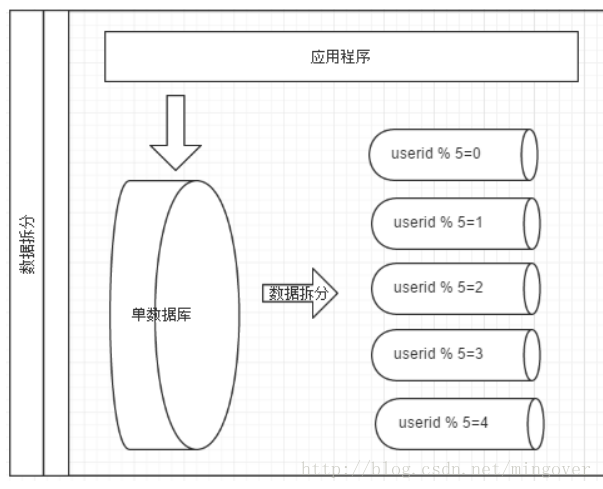 如图,切分原则都是根据业务找到适合的切分规则分散到不同的库,下面用用户 ID 求模举例: