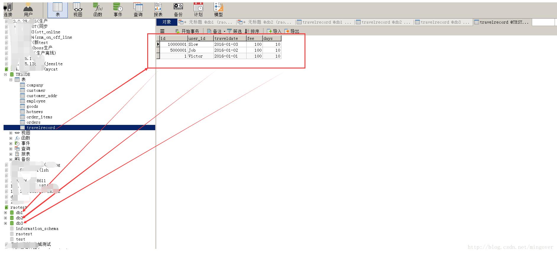 insert 三条数据进 mycat 的 TESTDB 的 travelrecord 表,