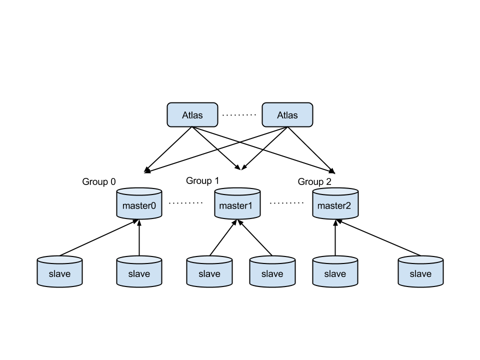 在Atlas中, 将一个组看做是数据存储的单位, 一个组由一台master, 零台或者多台slave组成(mysql主从同步需要由用户自己配置). 每个组之间的数据独立, 没有关系, 表的数据的各个部分存储在各个组中.