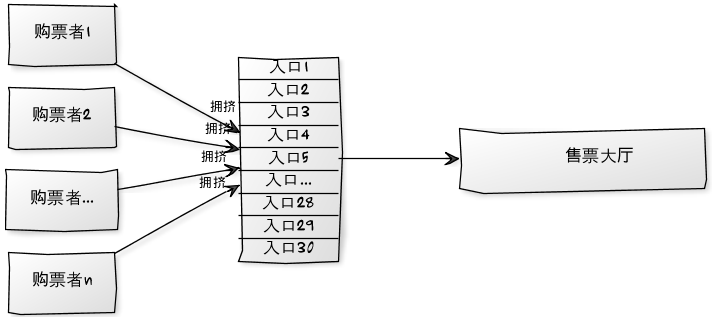 3.这30个入口我们看做一个管道(tube),假定每一个购票者给大概5分钟可以完成购票,那么超过5分钟后或者已经买到票,就会让出位置让后面的人进入售票大厅,当然这是理想化想法,但至少我们把压力控制在我们可以处理的能力之内,要不然服务器宕机,欲哭无泪。